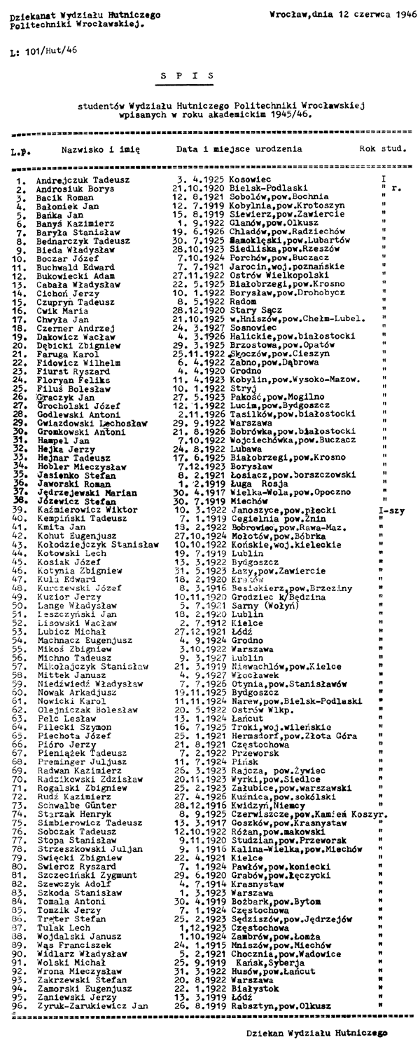Spis studentów Wydziału Hutniczego Politechniki Wrocławskiej wpisanych w roku akademickim 1945/1946