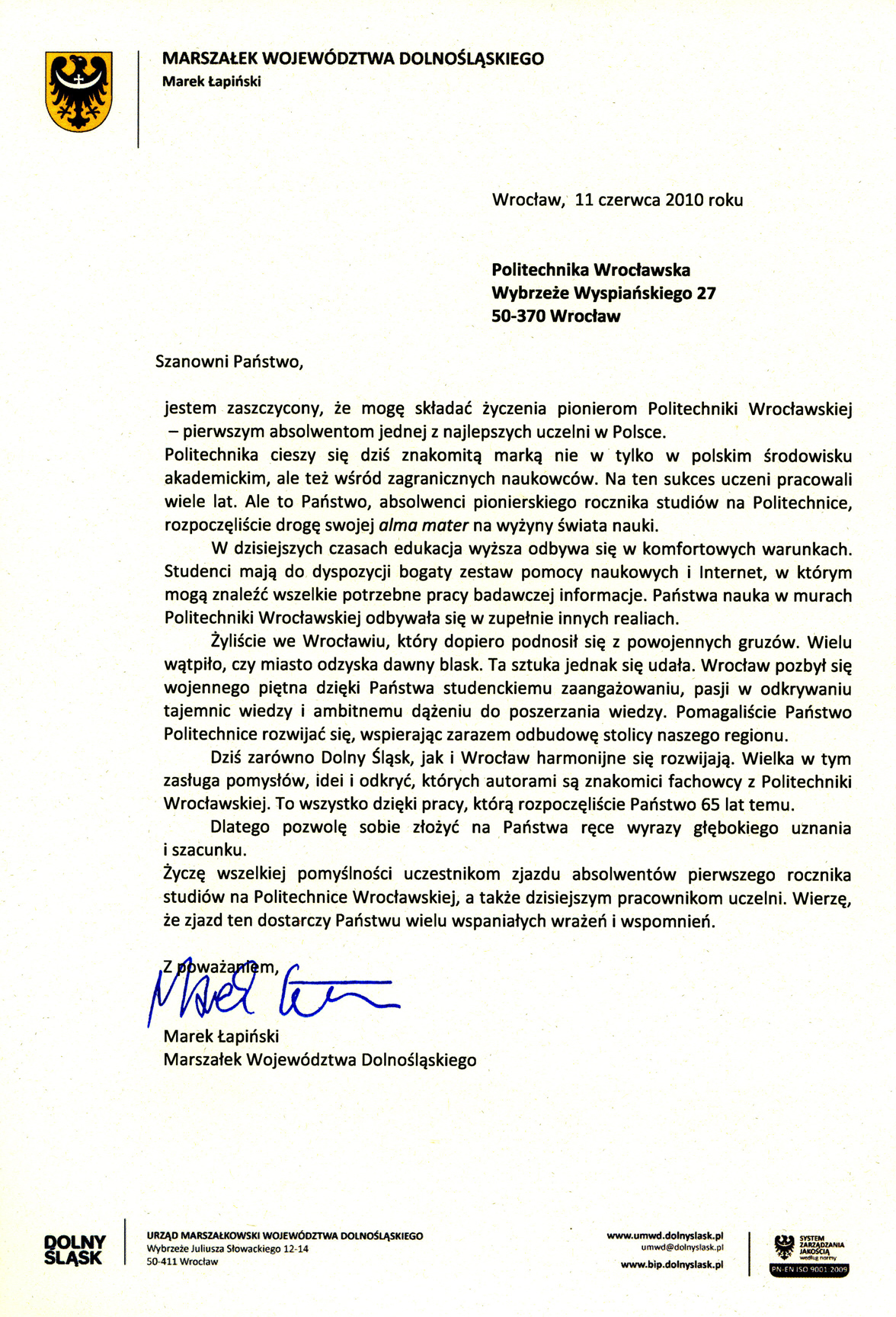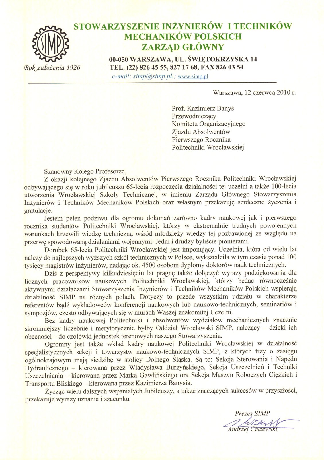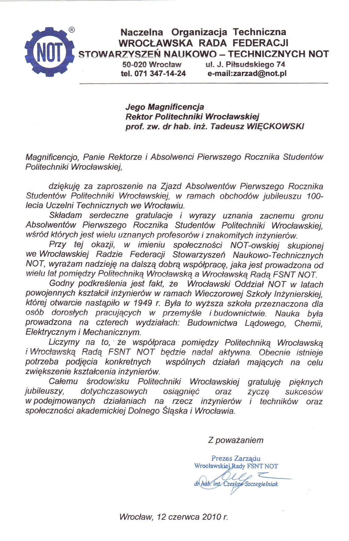 Patronat nad Zjazdem objął JM Rektor Politechniki Wrocławskiej, profesor Tadeusz