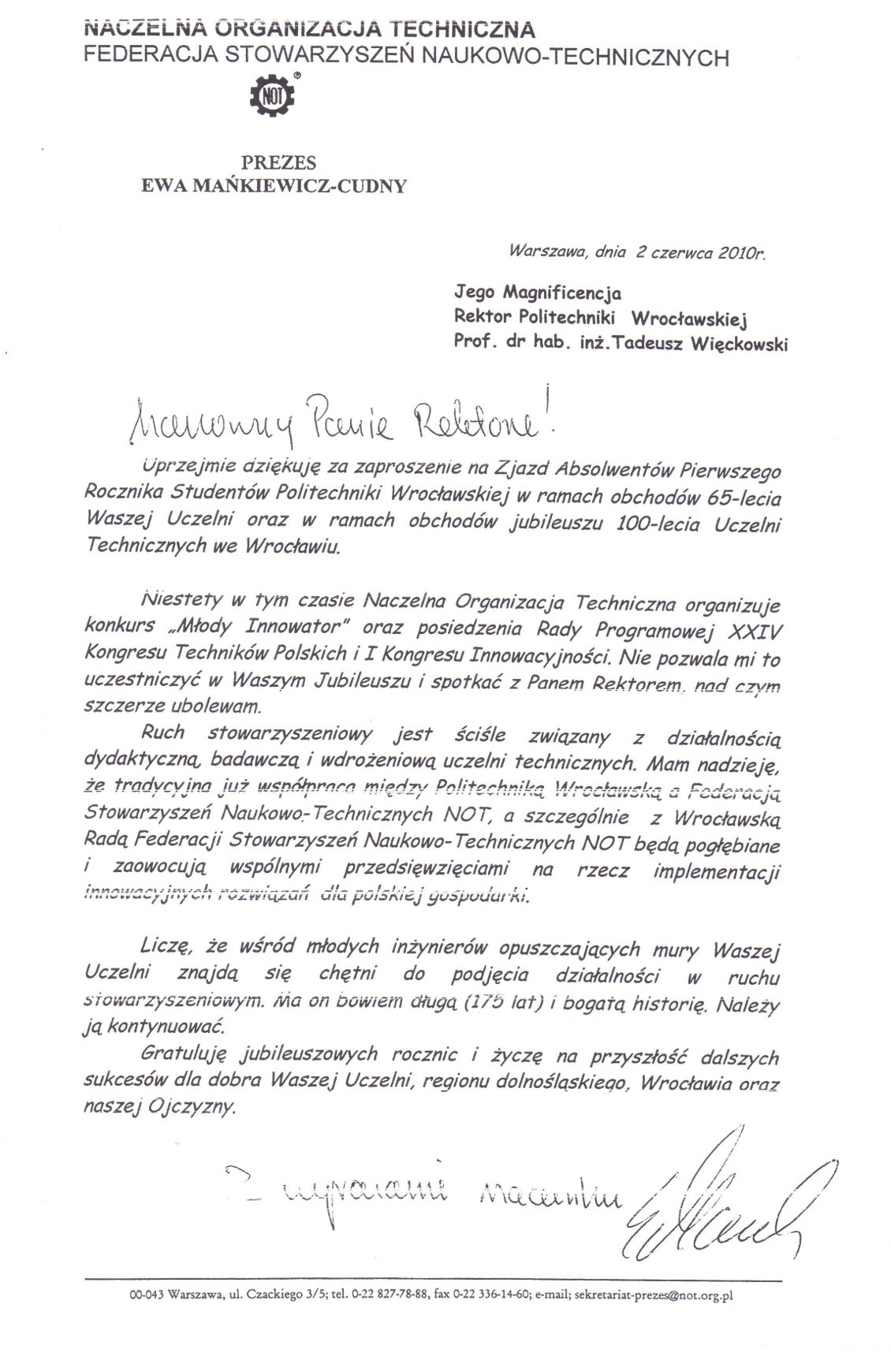 w ramach obchodów 100-lecia Uczelni Technicznych we Wrocławiu i 65-lecia