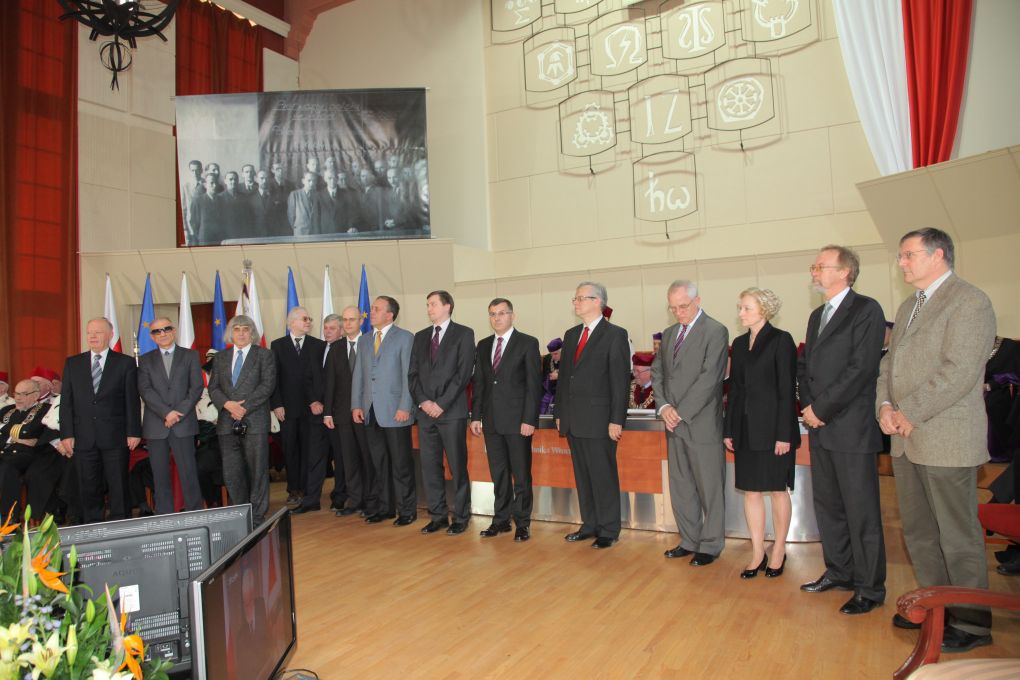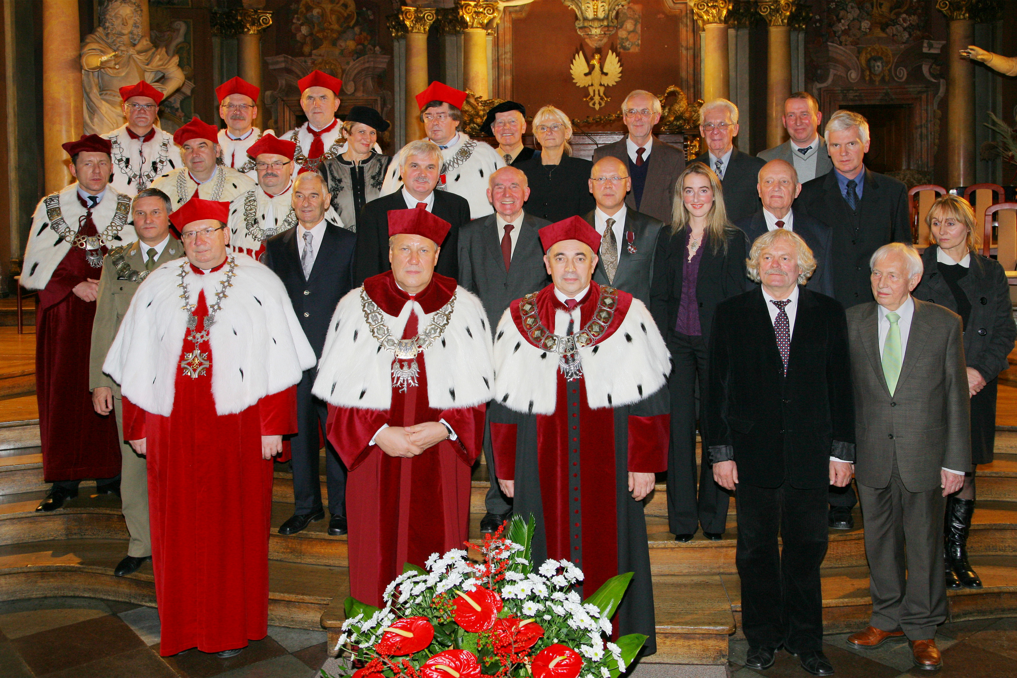 Członkowie Kolegium Rektorów Uczelni Wrocławia i Opola: W pierwszym rzędzie od prawej: prof. dr hab. inż. Tadeusz Więckowski (Politechnika Wrocławska), prof. dr hab. Marek Bojarski (Uniwersytet Wrocławski), Ks. prof. dr hab. Waldemar Irek (Papieski Wydział Teologiczny), gen. bryg. Kazimierz Jaklewicz (Wyższa Szkoła Oficerska Wojsk Lądowych). W drugim rzędzie od prawej: prof. dr hab. Ryszard Andrzejak (Akademia Medyczna), prof. Jacek Szewczyk (Akademia Sztuk Pięknych), prof. dr hab. Krystian Kiełb (Akademia Muzyczna). W trzecim rzędzie od prawej: prof. dr hab. Bogusław Fiedor (Uniwersytet Ekonomiczny), prof. dr hab. inż. Krystyna Czaja (Uniwersytet Opolski), prof. dr hab. Roman Kołacz (Uniwersytet Przyrodniczy), prof. dr hab. Juliusz Migasiewicz (Akademia Wychowania Fizycznego), prof. dr hab. Eugeniusz Józefowski (Państwowa Wyższa Szkoła Zawodowa w Głogowie).